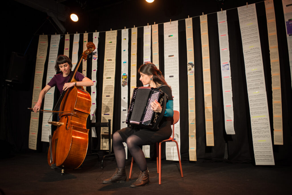 Dans l’espace vide, un accordéon et une contrebasse. Deux femmes chantent et parlent : Qu’avons-nous reçu en héritage ? Quelles sont celles qui ont pris des chemins de traverse ? Comment suivre leurs traces ? Traversées par les écrits d’hier et d’aujourd’hui, les musiciennes créent une ligne sonore pour dire les voix de femmes, leurs interrogations, leurs combats.